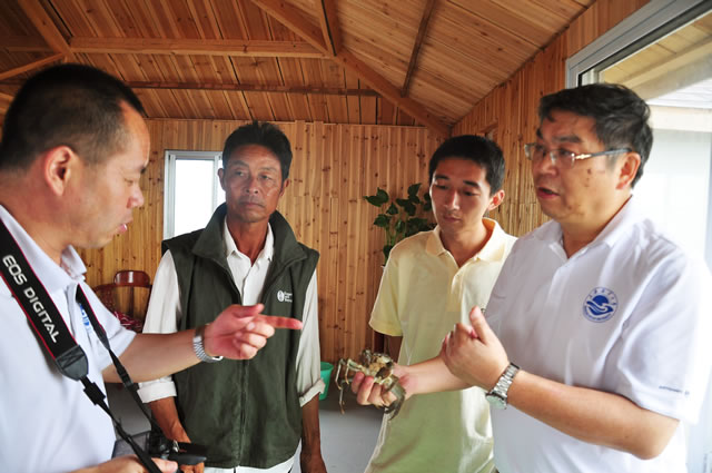 苏州市正谷阳澄湖大闸蟹生态养殖专业合作社的技术人员,毕业于上海海洋大学水产与生命科学学院的吕东锋硕士、汪清硕士陪同王武教授与上海海洋大学博士团参观考察了正谷阳澄湖大闸蟹生态养殖基地。王武教授带领的博士团成员在正谷基地就今年湖中的水草养殖、大闸蟹的发育脱壳等情况进行了详细的调查。
